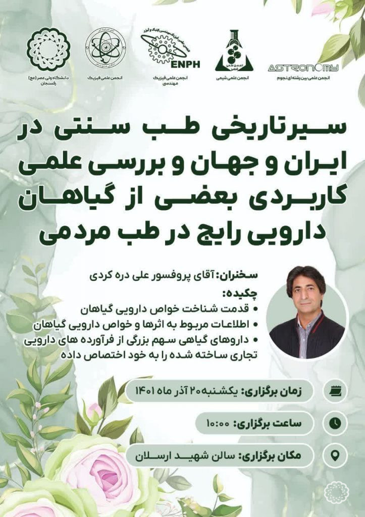 - سمینار سیر تاریخی طب سنتی در ایران و جهان و بررسی علمی کاربردی بعضی از گیاهان دارویی رایج در طب مردمی